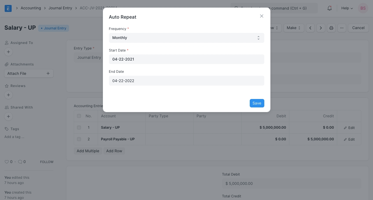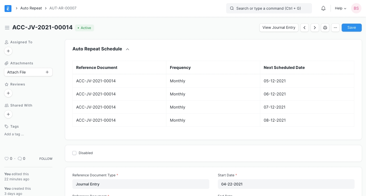 Set the Start Date and End Date (optional). If End Date is not specified, recurring documents will be created, unless the Auto Repeat is disabled.