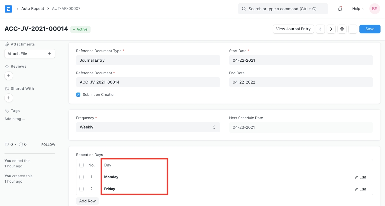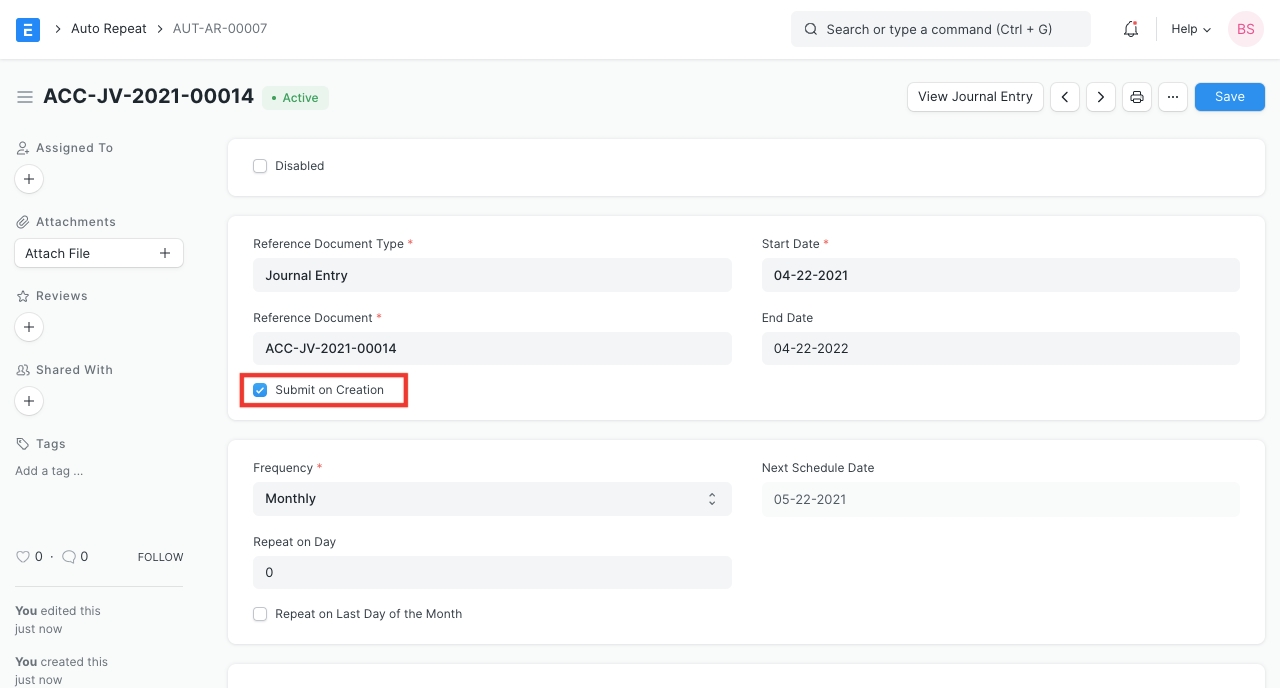 Set the Frequency for creating repeatable documents (Daily, Weekly, Monthly, Quarterly, Half-yearly, Yearly).