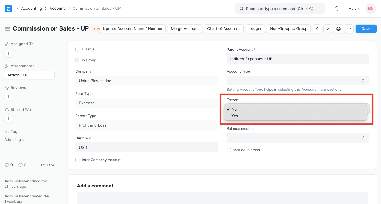 Once an Account is Frozen, you won't be able to use it for any accounting transaction.