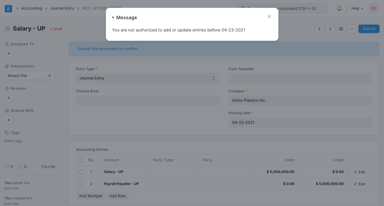 Now, the system will not allow to make any accounting entries before set date. If at all someone tries creating entries, system will show error message as below.