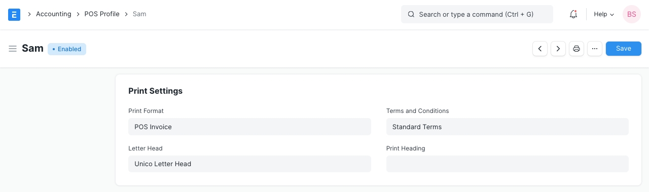 POS Sales Invoice headings can also be changed when printing the document. For example, the heading can be 'Invoice', or 'Bill'. You can do this by selecting a Print Heading. To create new Print Headings go to: