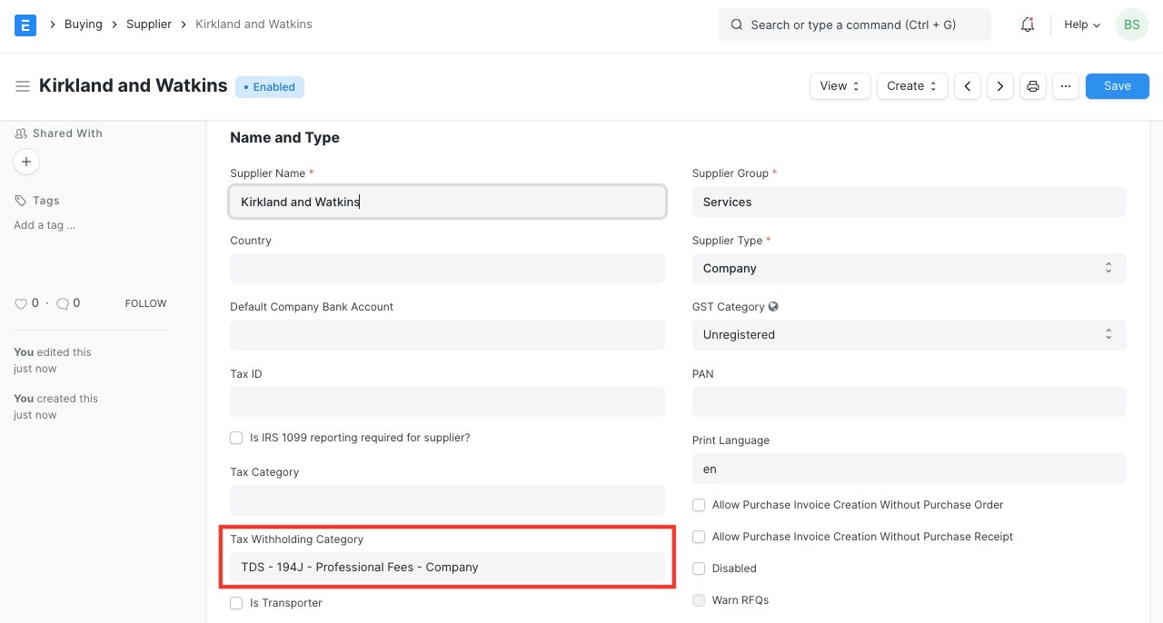 Tax Withholding Category is Tax Deducted at Source.