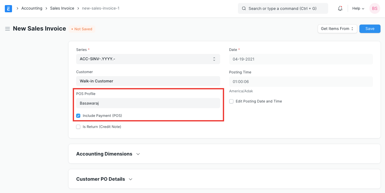 If you check the Is POS checkbox, then all your POS Profile data is fetched into the Sales Invoice and you can easily make payments.
