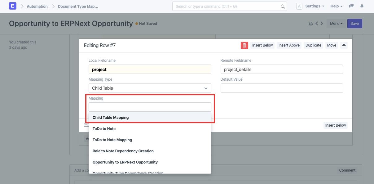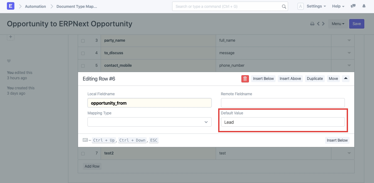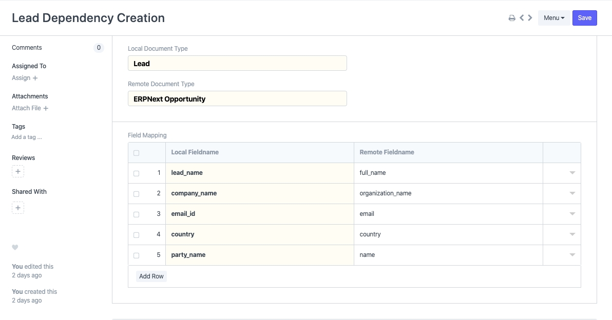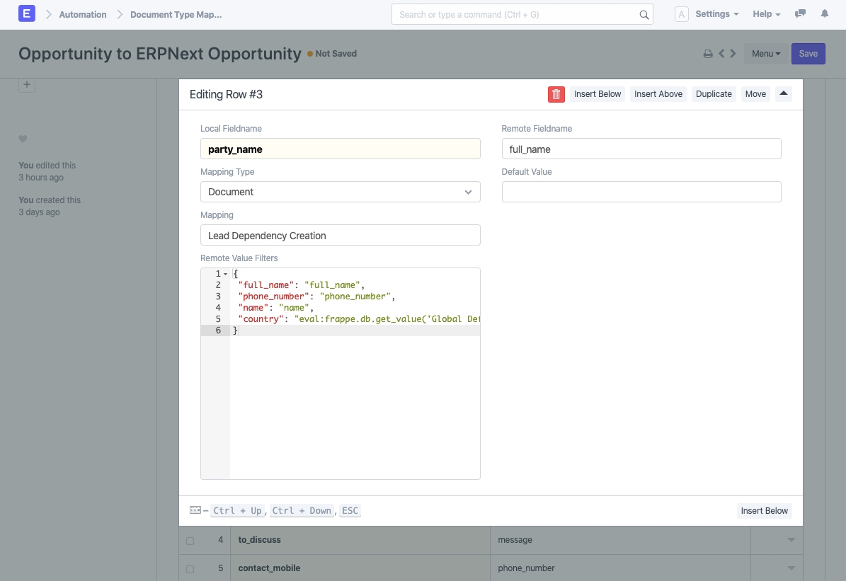 Remote Value Filters: You need to specify the filters that will fetch the exact remote document to be mapped. Like in this case, the remote DocType is ERPNext Opportunity which can be uniquely fetched using name, phone number and country.