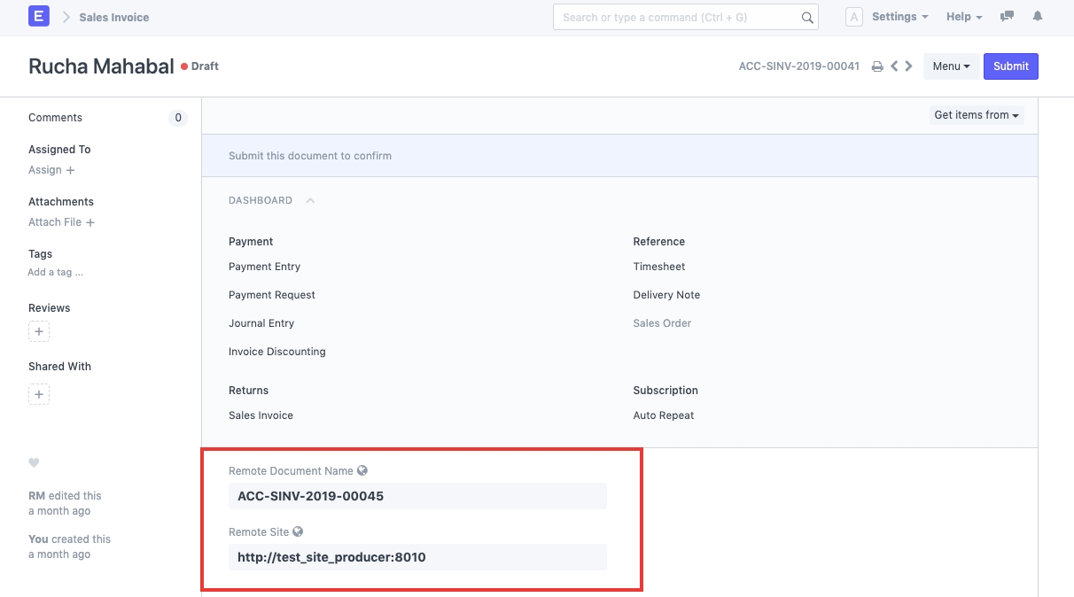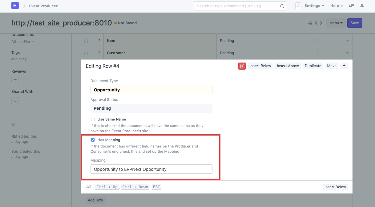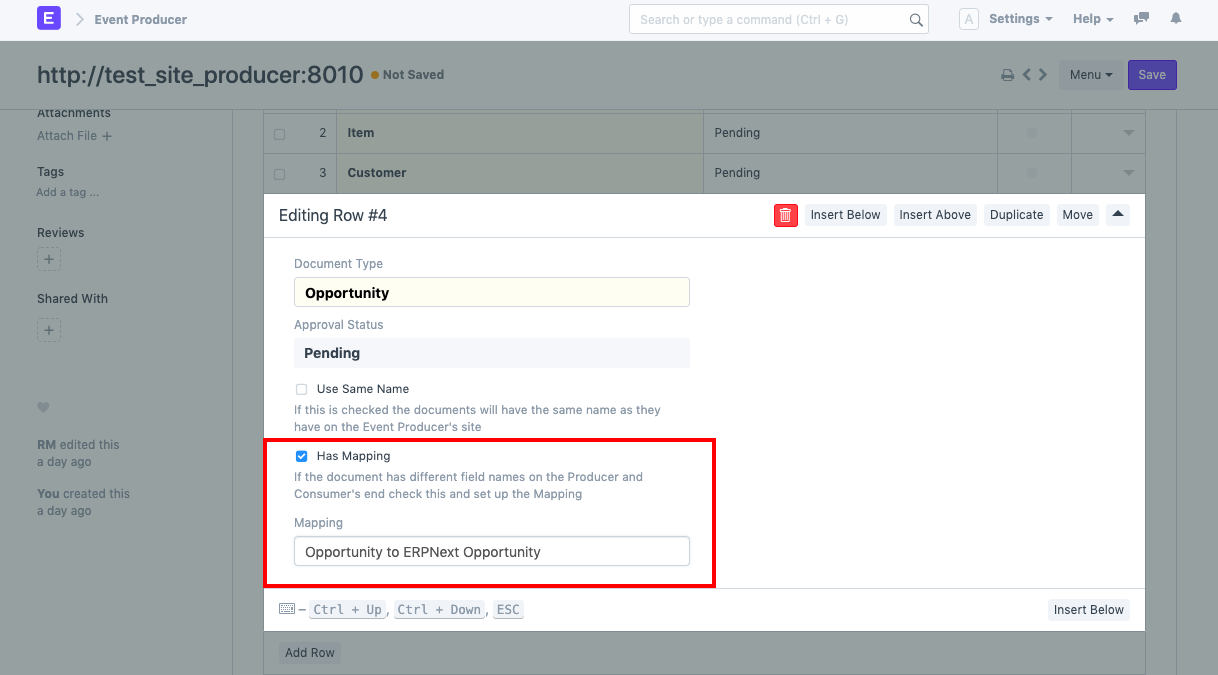 Note: For Document Types that have naming series, it is advised to keep the 'Use Same Name' checkbox unchecked, to prevent naming conflicts. If this is unchecked, the Documents are created by following the naming conventions on the current site and the 'Remote Site Name' and 'Remote Document Name' custom fields are set in the synced document to store the Event Producer site URL and the document name on the remote site respectively.