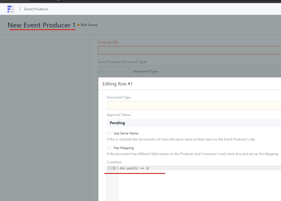 After saving, an Event Consumer is created on the producer site (http://testsiteproducer:8000). The keys of the user on the consumer site are automatically copied to the Event Consumer document on the producer site in this process.