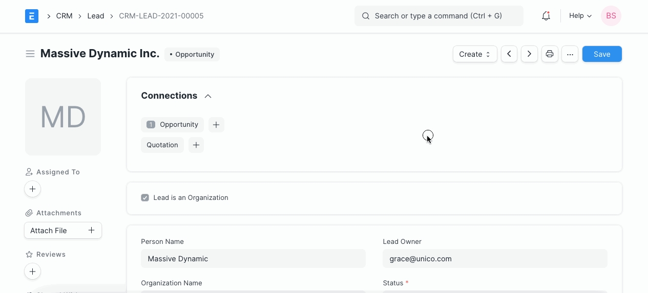 A Lead can be converted to a Customer by selecting “Customer” from the Make dropdown. Once the Customer is created, the Lead becomes “Converted” and any further Opportunities from the same source can be created against this Customer.