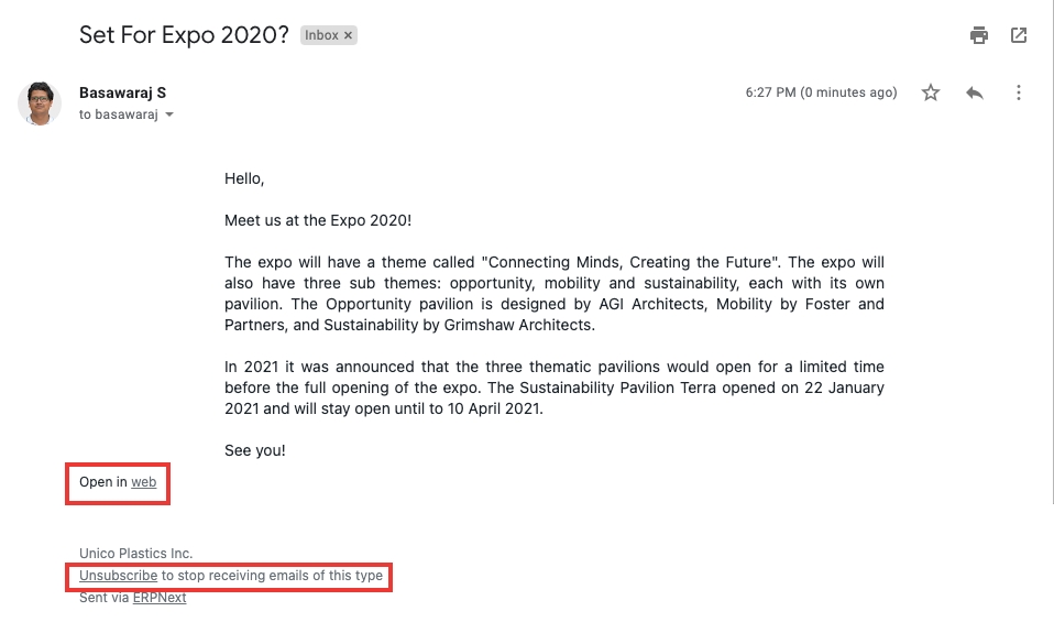 Below is the screenshot of the email received with link to unsubscribe and a link to open the email on the web.