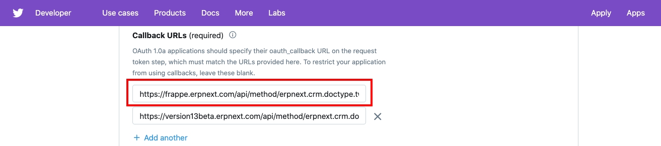 https://{yoursite}/api/method/erpnext.crm.doctype.twitter_settings.twitter_settings.callbackClick Save to make changes.