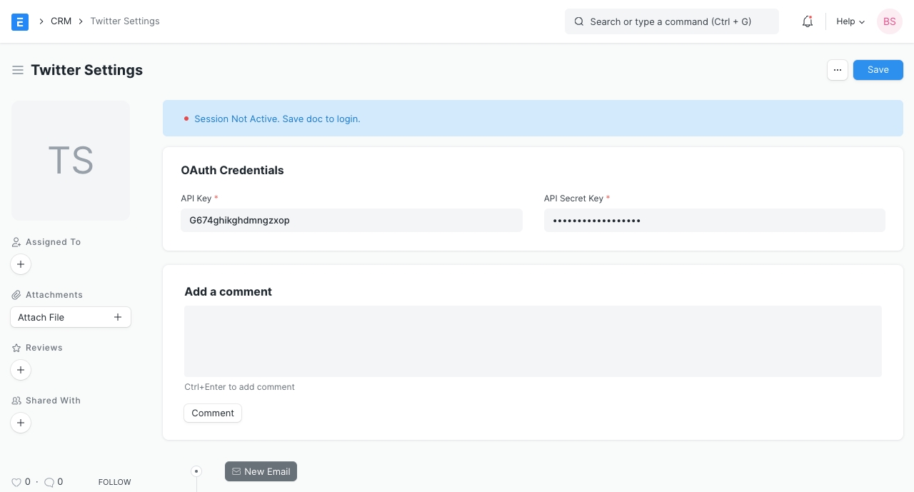 Twitter related settings like OAuth can be configured here. ERPNext needs access to the API through which the post is shared and achieved using OAuth 2.0 Authentication Protocol.