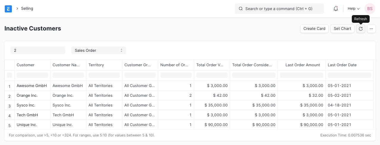 This report shows the list of customers who have not purchased since specific number of days. You can mention the number of days in 'Days Since Last Order' filter. Also you can mention if Sales Order or Sales Invoice is to be considered in DocType filter.
