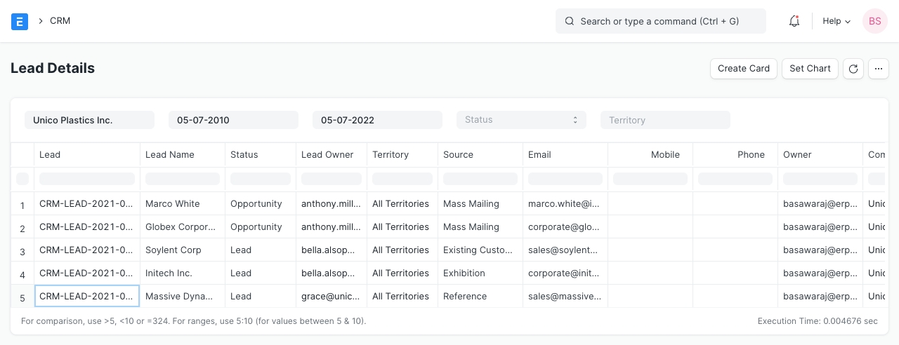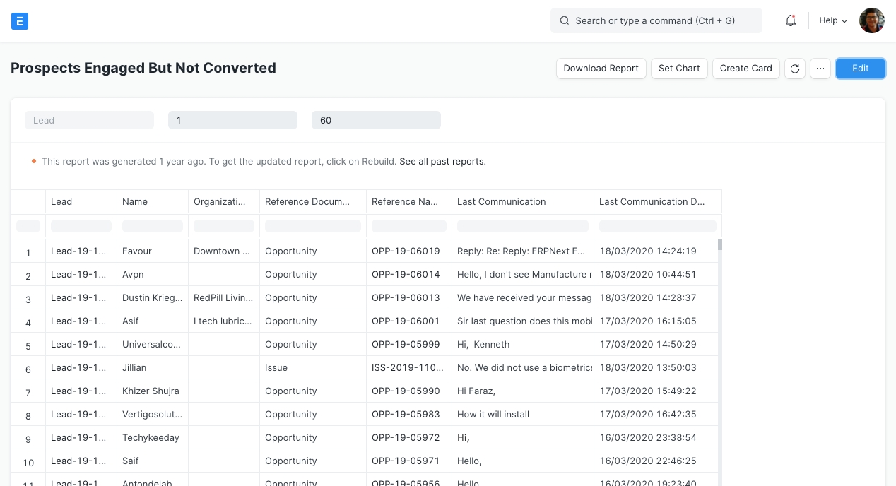 CRM module's reports feature helps users get the information about the prospects. Using the following reports, an ERPNext user can analyze the data about a prospect's history with a company and will help users build strong relationships with the prospects. These are a collection of reports under CRM > Reports.