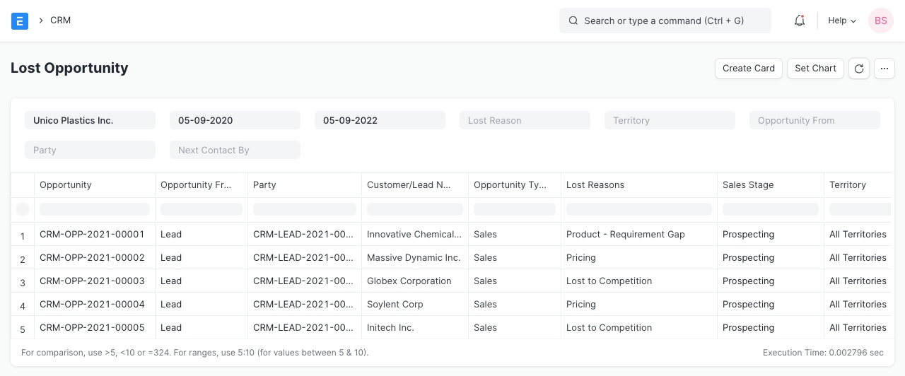 This report provides Lost Opportunity details like opportunity from, party, customer name, lost reasons, sales stage, territory, and other details.