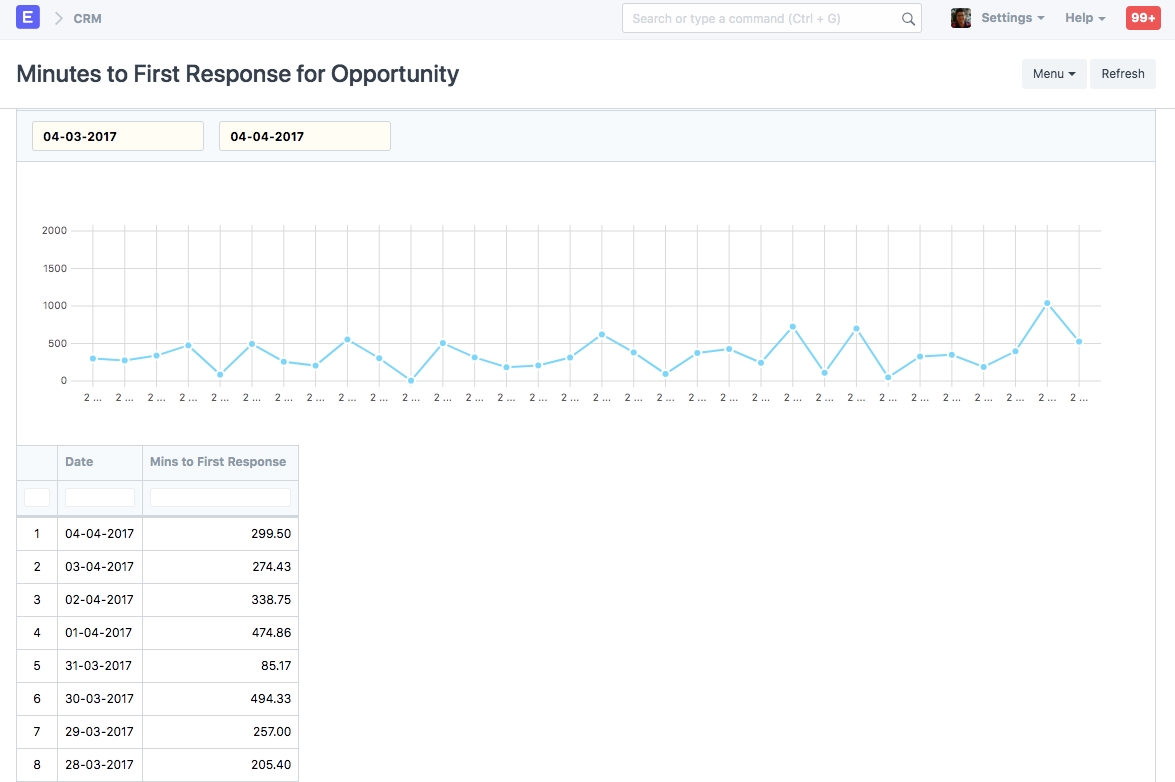 You can input the date range for which you would like to analyse the minutes to first response. The line graph is shown on the top and date wise details at the bottom.