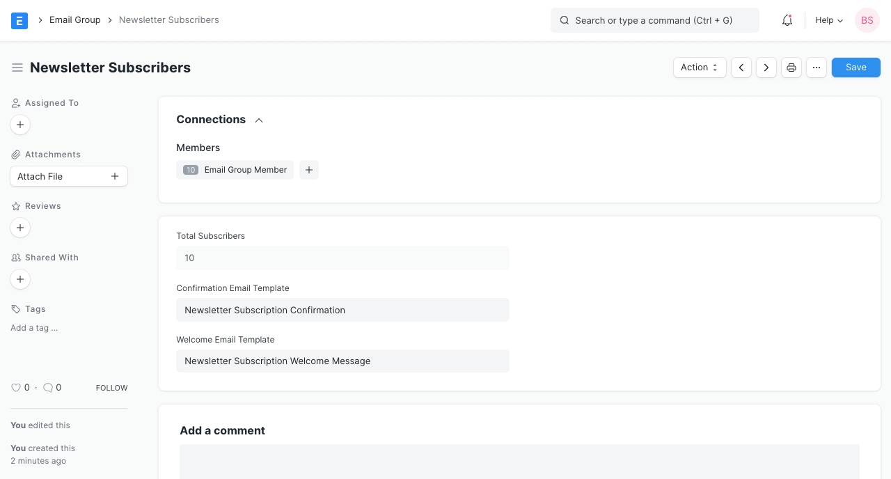 You can specify the confirmation email and welcome email template for the email group. A confirmation email will be sent to confirm a person's subscription to your newsletter. The welcome email is sent when the person confirms their subscription to your email newsletter.
