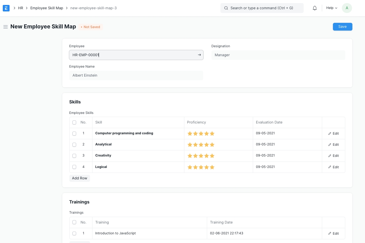 Employee Skill Map is a record which helps your organization track your Employee's skill sets and trainings. It can be used to rate each skill of the Employee and track their growth after each internal training. This data can be used at the time of appraisals.