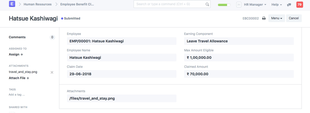 Employee Benefit Claim allows Employees to - 1. Claim flexible benefits which are to be received lump-sum (if Salary Component is Pay Against Benefit Claim) 2. Claim tax exemption for flexible benefits received pro-rata, as part of salary when Deduct Tax For Unclaimed Employee Benefits is checked in Payroll Entry / Salary Slip