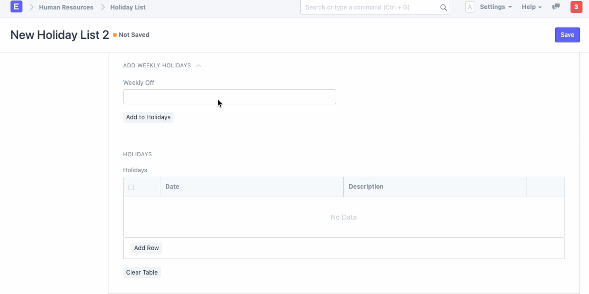 Enter Holiday List Name. It can be based on the Fiscal Year or Location or Department as per the requirement.