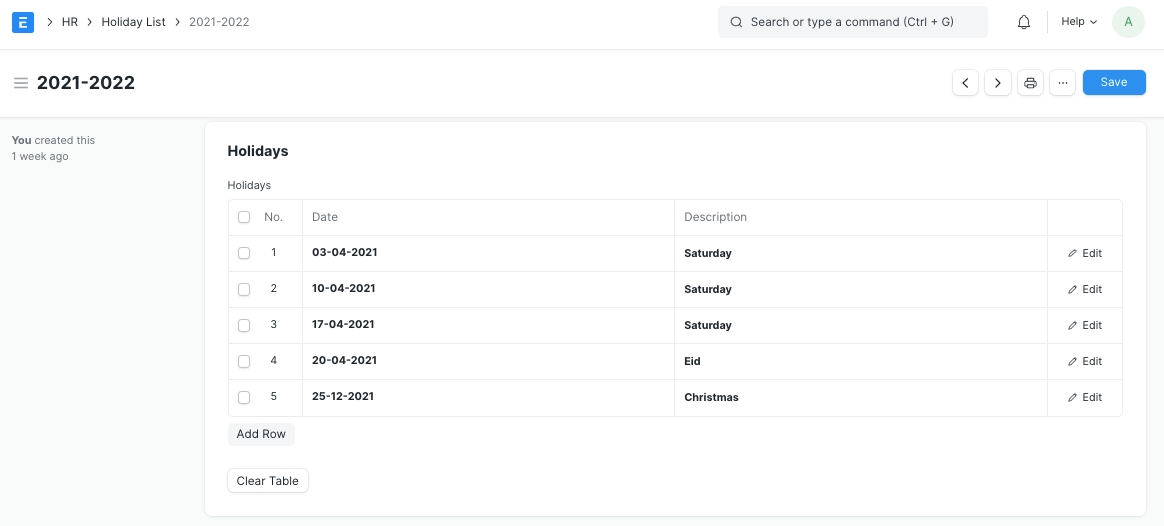Once the Weekly Offs are added, it is reflected in the Holidays table.