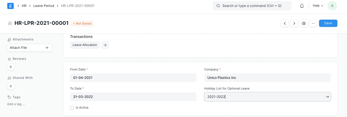 Additionally, you can check the 'Is Active' checkbox if you want to enable this particular Leave Period.