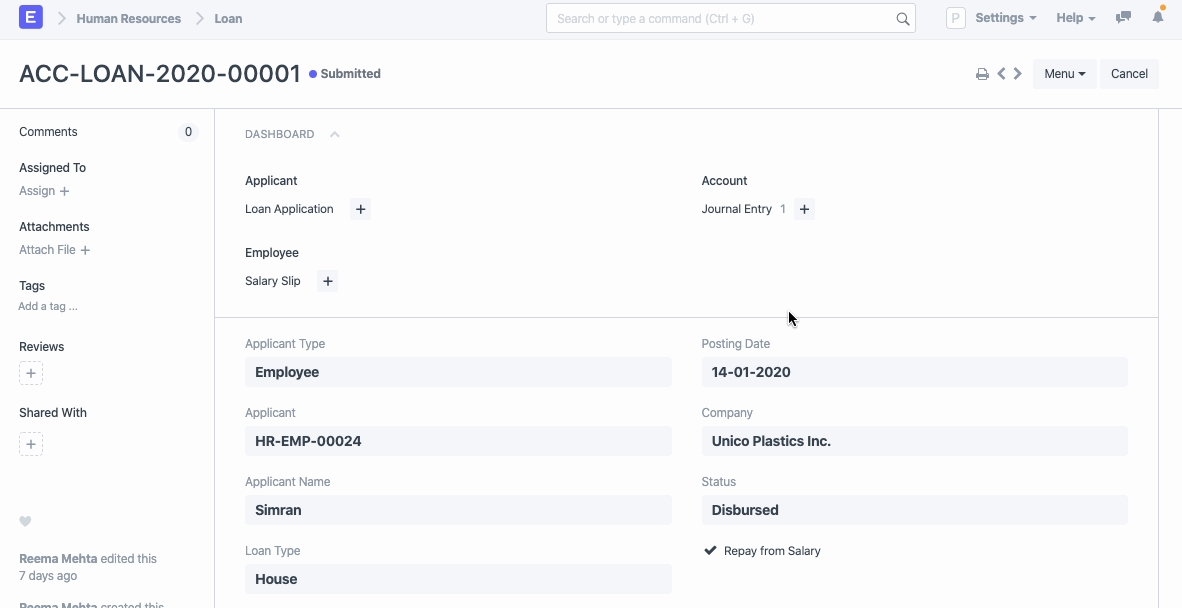 Loan amount is deducted from the salary. If the employee is on leave without pay for some period, the existing loan can be extended without the need for creating a new loan. This can be done be editing the Repayment Schedule table even after submitting the loan.