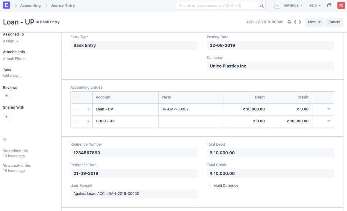 After submitting the Loan document, if the status is "Sanctioned", you can click on "Create Disbursement Entry" to create a Journal Entry of the Loan.