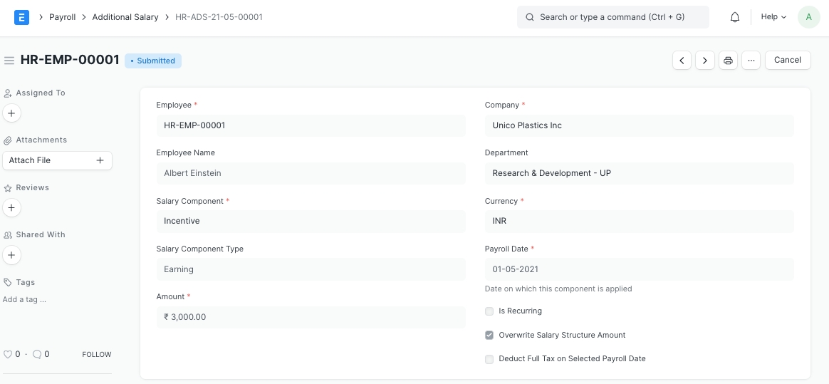 This feature allows users to create an Additional Salary for a fixed interval. When 'Is Recurring' is checked you need to fill 'To Date' and 'From Date'. This will add or deduct the additional salary amount for this employee within the selected date range and it will be reflected in the Salary Slip for the employee. The Additional Salary will be repeated every month between 'From Date' and 'To Date' interval.