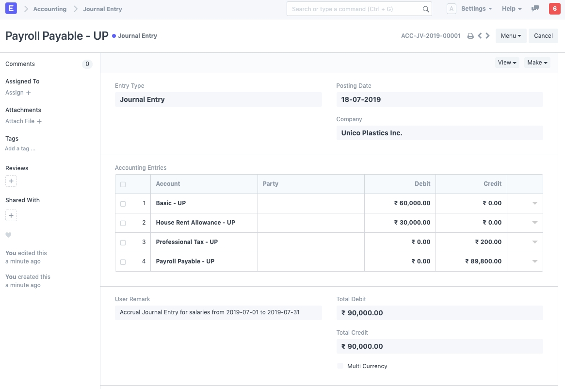 This will also book the default Payroll Payable account against respective Expense Heads (as configured in Salary Components) to record the accrual of salary to employees.