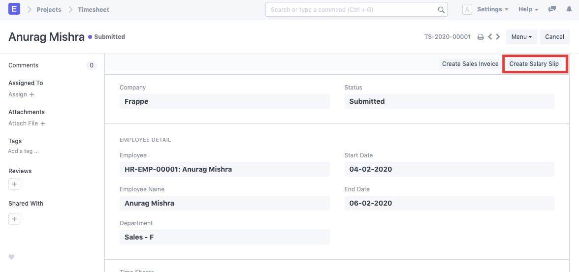 ERPNext also provides an option to create Salary slip based on working hours based on Timesheet. You can create Salary Slip after submitting the Timesheet by clicking directly on Create Salary Slip button on the top right.