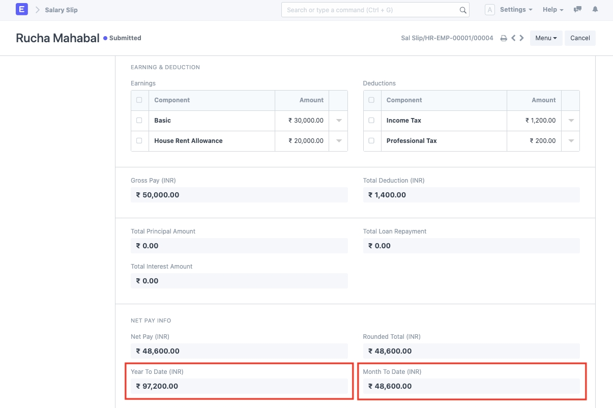 Month to Date: Total salary booked for a particular employee from the beginning of the month (for which the payroll entry is created) up to the current salary slip's end date.
