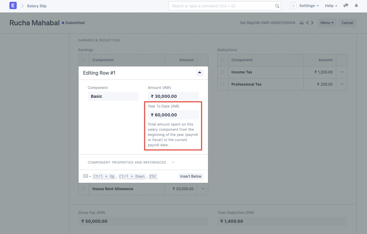 Year to Date is also computed for every component in the earnings and deduction tables. The "Salary Slip with Year to Date" print format is available with Year to Date and Month to Date computations.