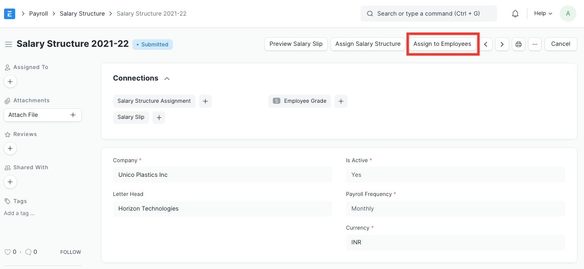 If you want to bulk assign the Salary Structure to multiple employees, you can do so via the 'Assign to Employees' button.