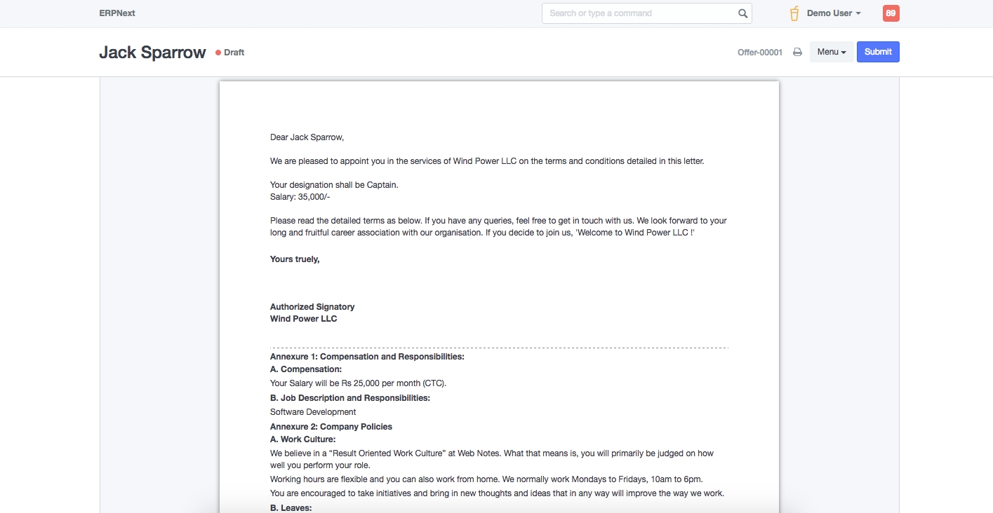You can create a pre-designed print format to print you Job Offer. To do so, select the Letter Head and Print Heading in the Printing Details section.