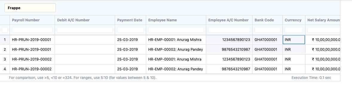 This report helps you to track bank transactions of payroll entries between companie(s) and employees. It shows the transaction between the bank accounts of the Company and the Employee with the Payment Date.