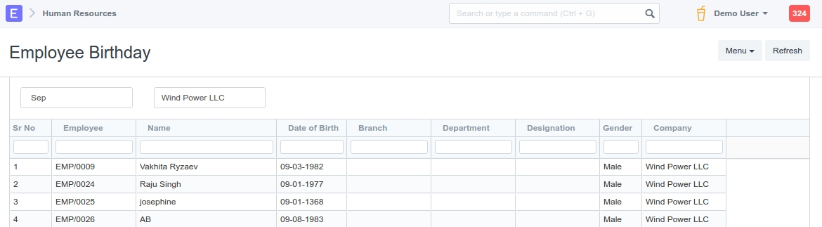 Employee Birthday Report shows month-wise birthdays of your Employees.