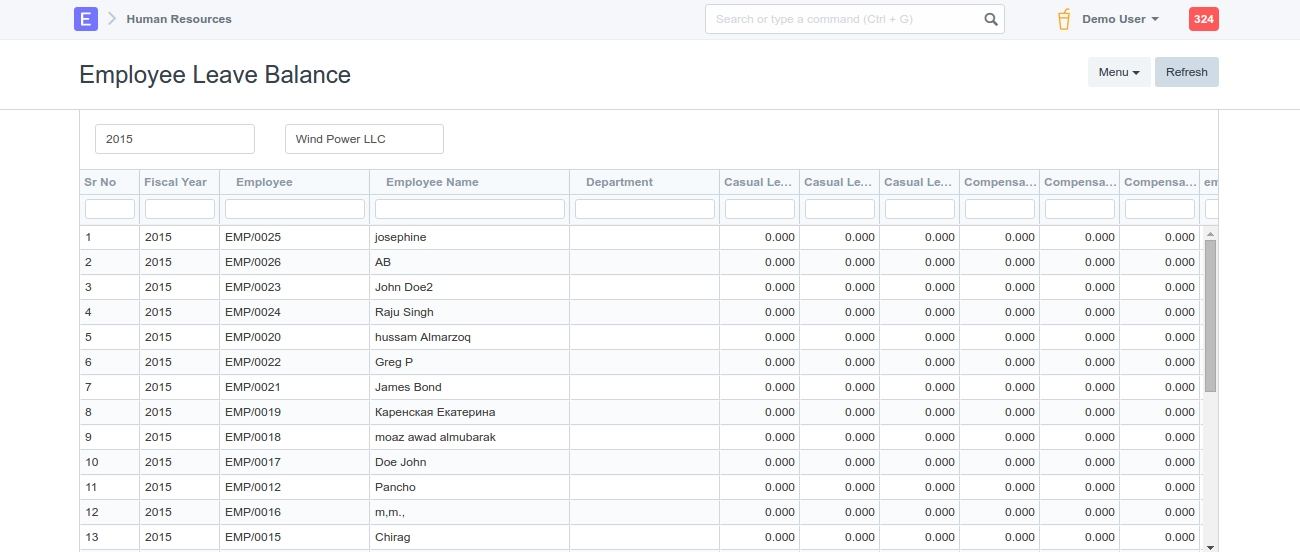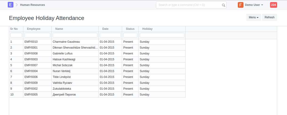 Employee Holiday Attendance shows the list of Employees who attended on Holidays.
