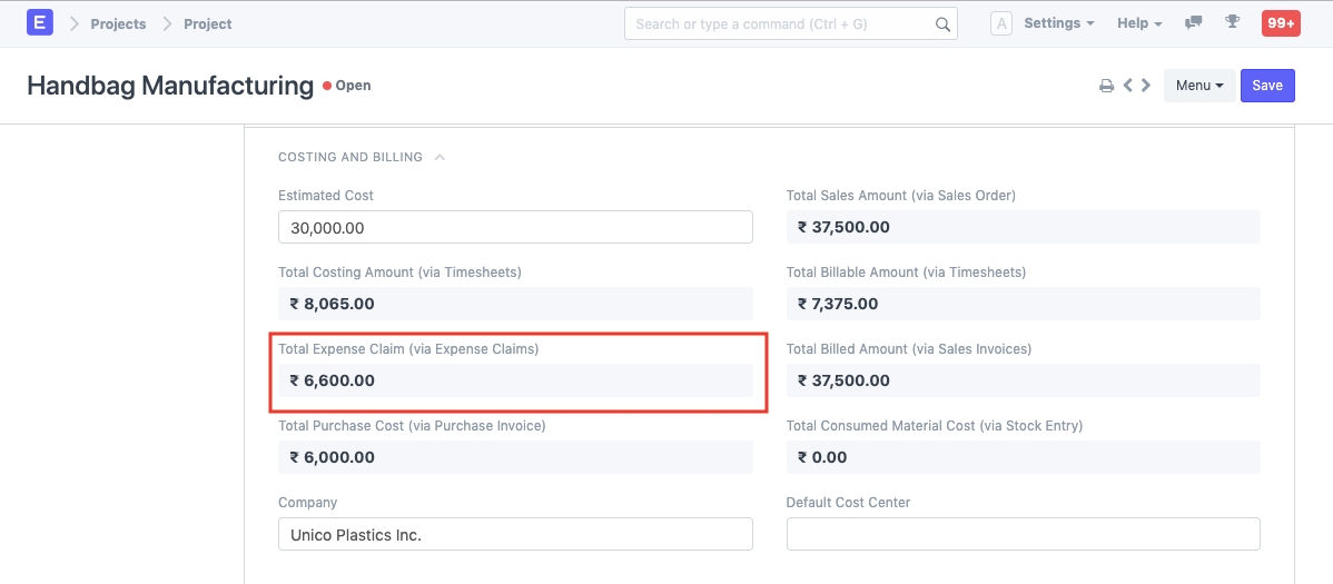 Based on the Expense Claims made for a particular project, total Expense Claim Amount is updated in the Project master, under project costing section.