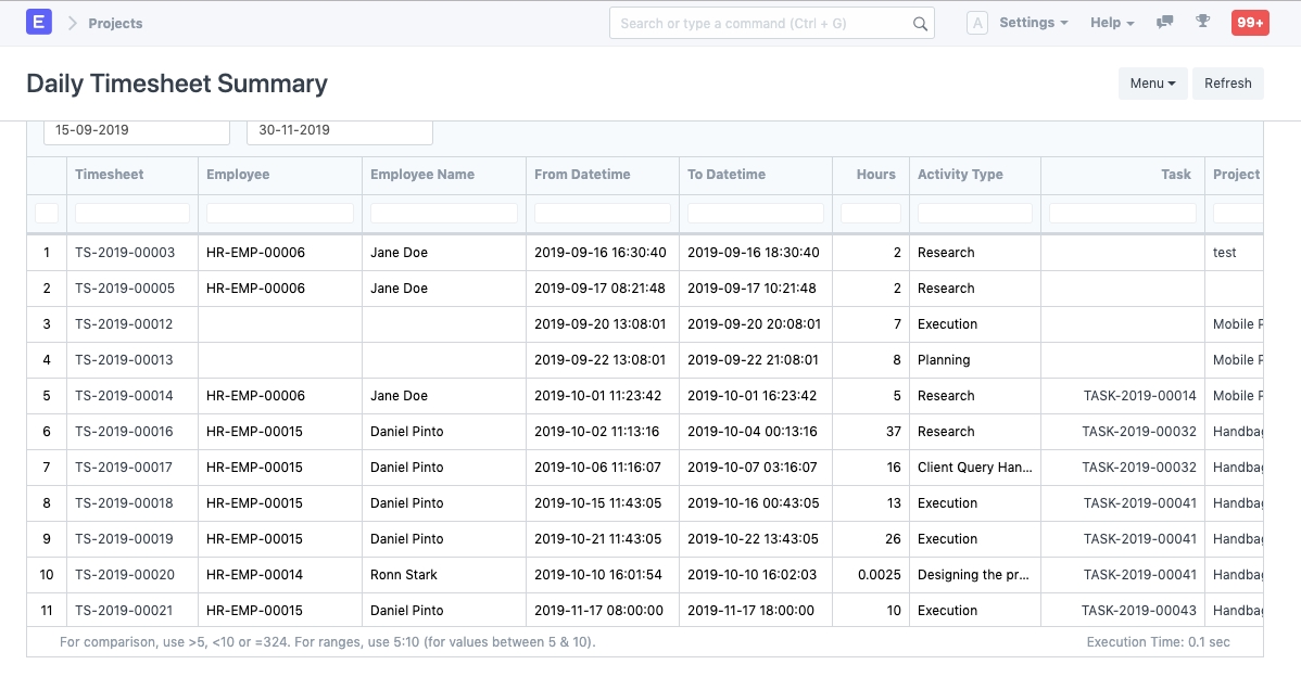 You can select a specific project and date range in the filters. Details of the Timesheets logged by any Employee for the selected Project between the range specified will be shown.