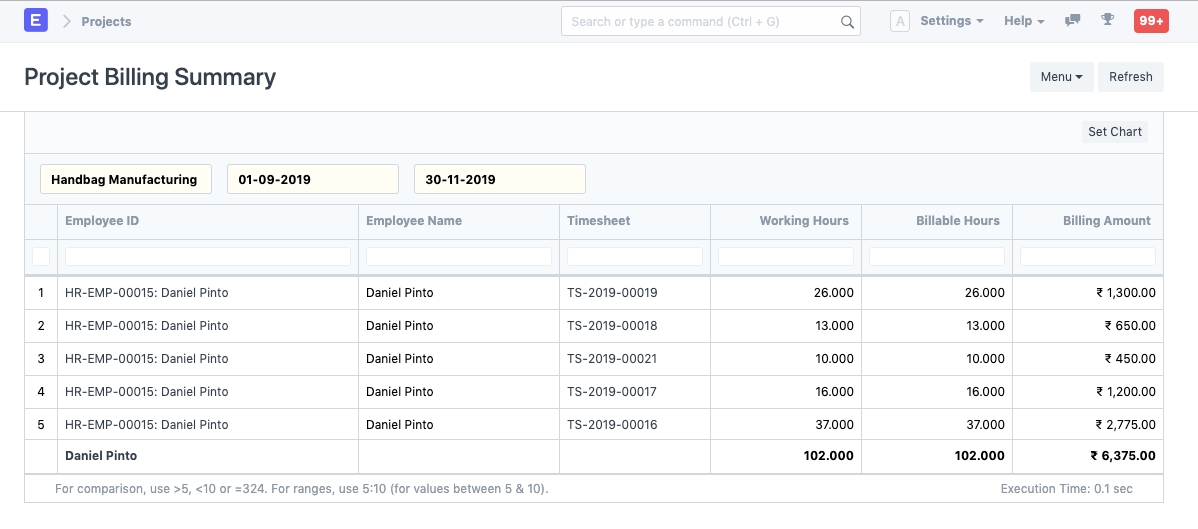 This report helps you analyze the billing per Project and Employee between a specific period.