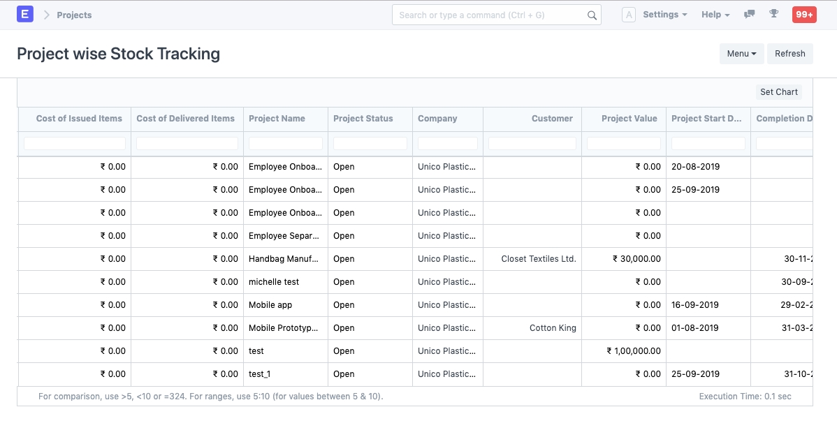 The Report will also contain the costing details of these stock movements. You can filter the details by Project Name, Customer, Project Start Date or End Date.