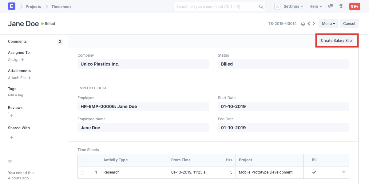 To enable the same, you may choose to create the Employee's Salary Slip directly from a Timesheet.