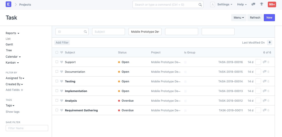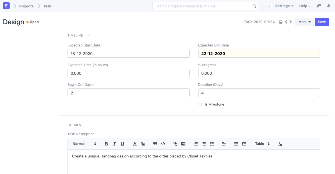 Project: In case a task is added independently, you may choose to link the task to a particular Project. If the task is created from a Project, the details of the Project will get automatically added.