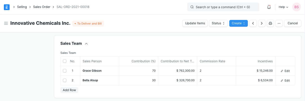 If more than one sales persons are working together on an order, then contribution (%) should be set for each Sales Person.