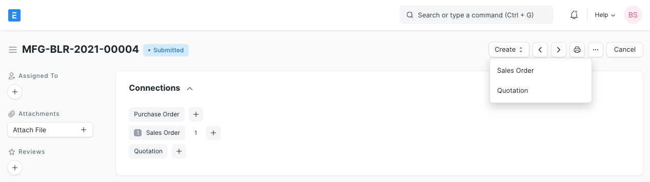 Once a Blanket Order is submitted, you can create new Quotations by clicking on Quotation under the Create button.