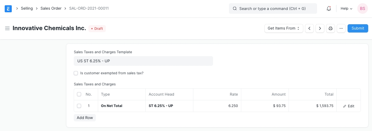 To add taxes to your Quotation, you can select a Sales Taxes and Charges Template or add the taxes manually in the Sales Taxes and Charges table.