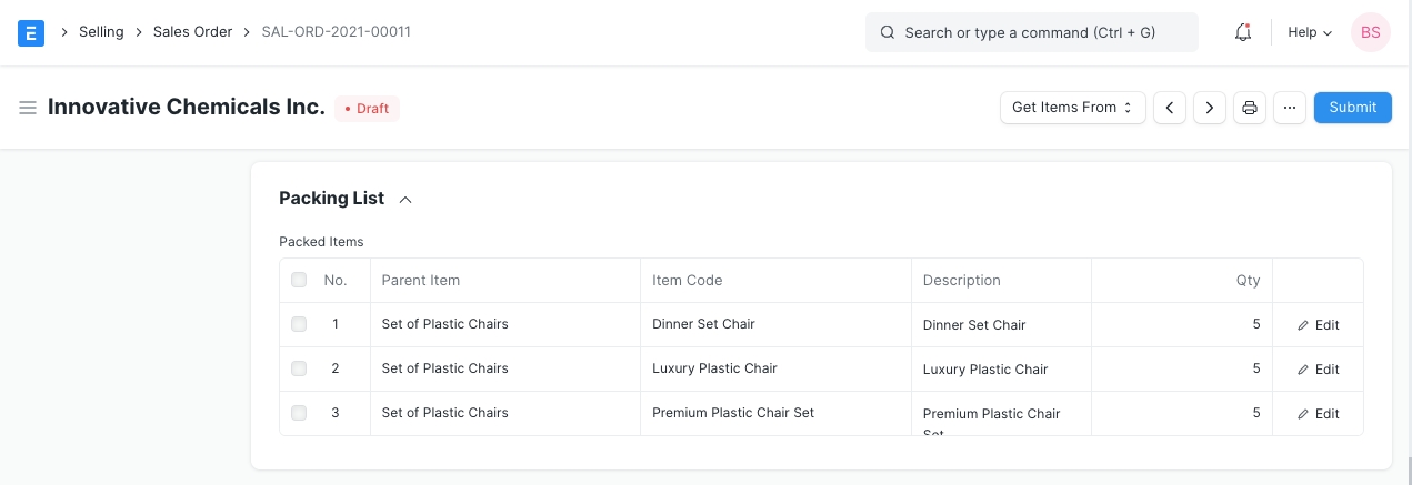 The “Packing List” table will be automatically updated when you “Save” the Sales Order. If any Items in your table are Product Bundle (packets), then the “Packing List” will contain the exploded (detailed) list of your Items.