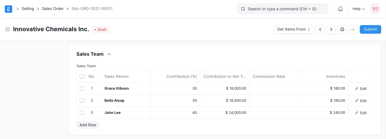 Sales Persons: ERPNext allows you to add multiple Sales Persons who may have worked on this deal. You can change the contribution percentage of the Sales Persons and track how much incentives they earned on this deal.