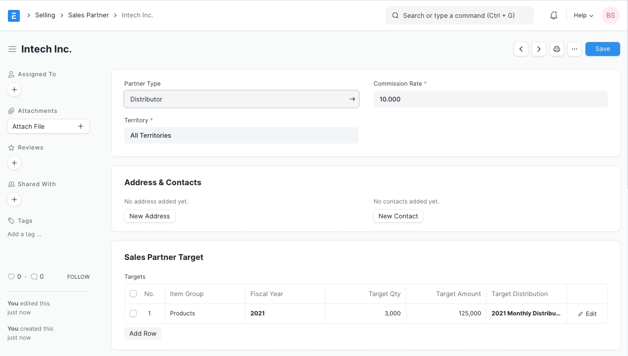 You can add and track a Sales Partner's Addresses and Contact details. These can be added in the Address & Contacts section in a Sales Partner: