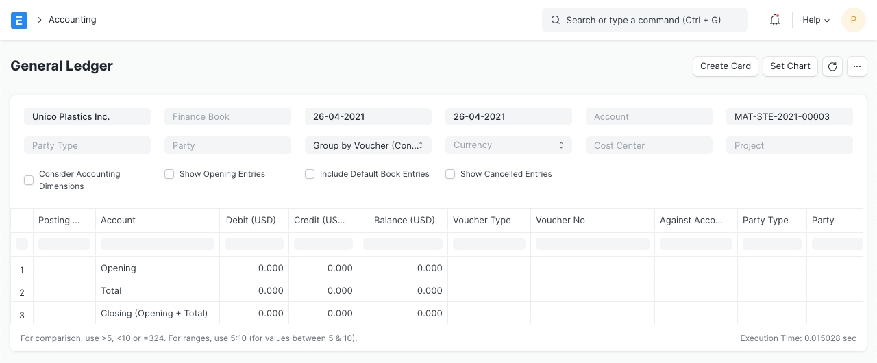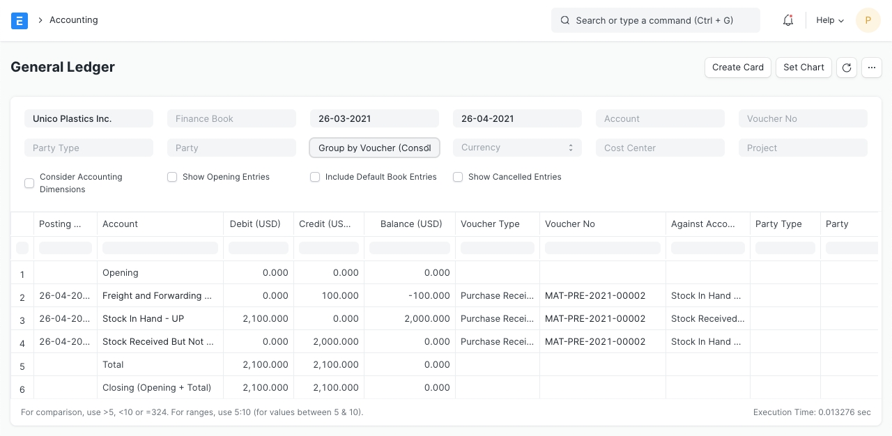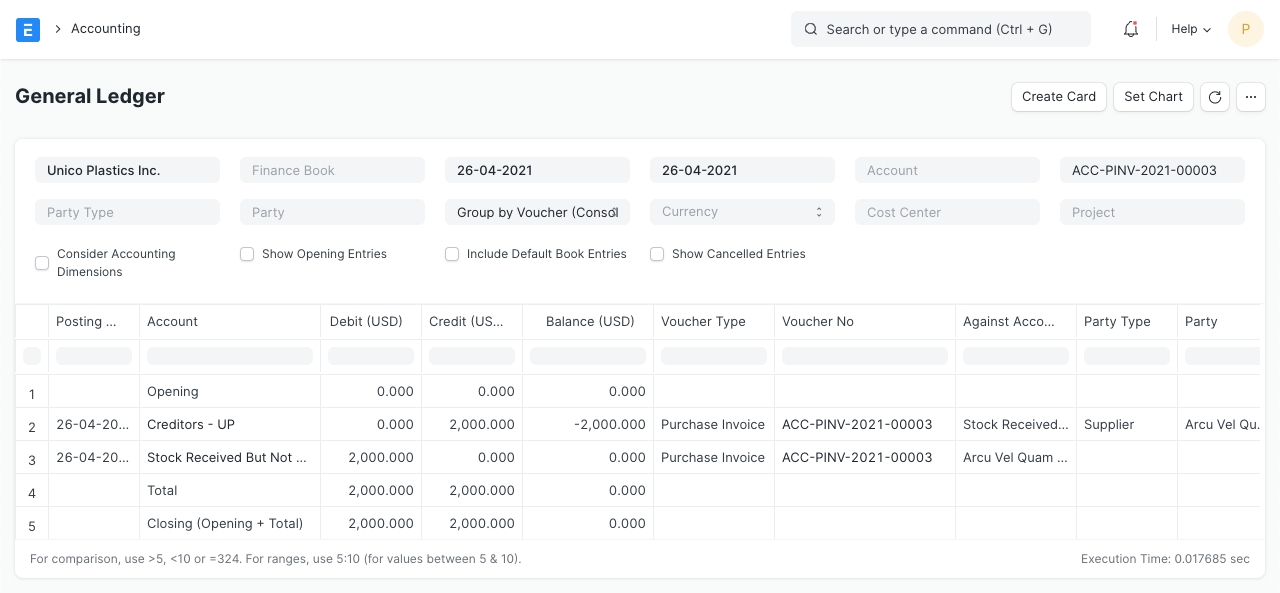 On receiving Bill from supplier, for the above Purchase Receipt, you will make Purchase Invoice for the same. The general ledger entries are as follows: