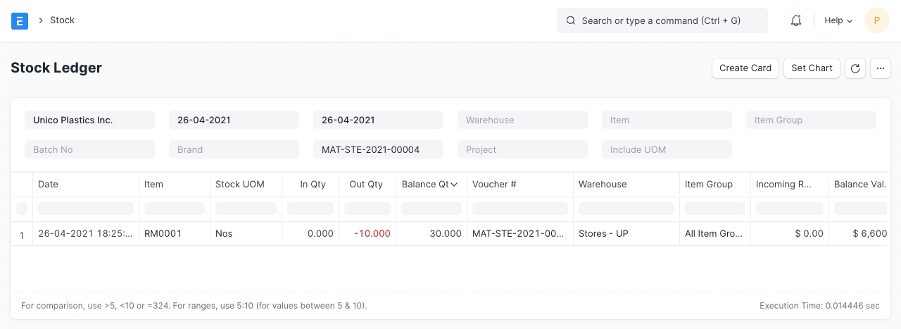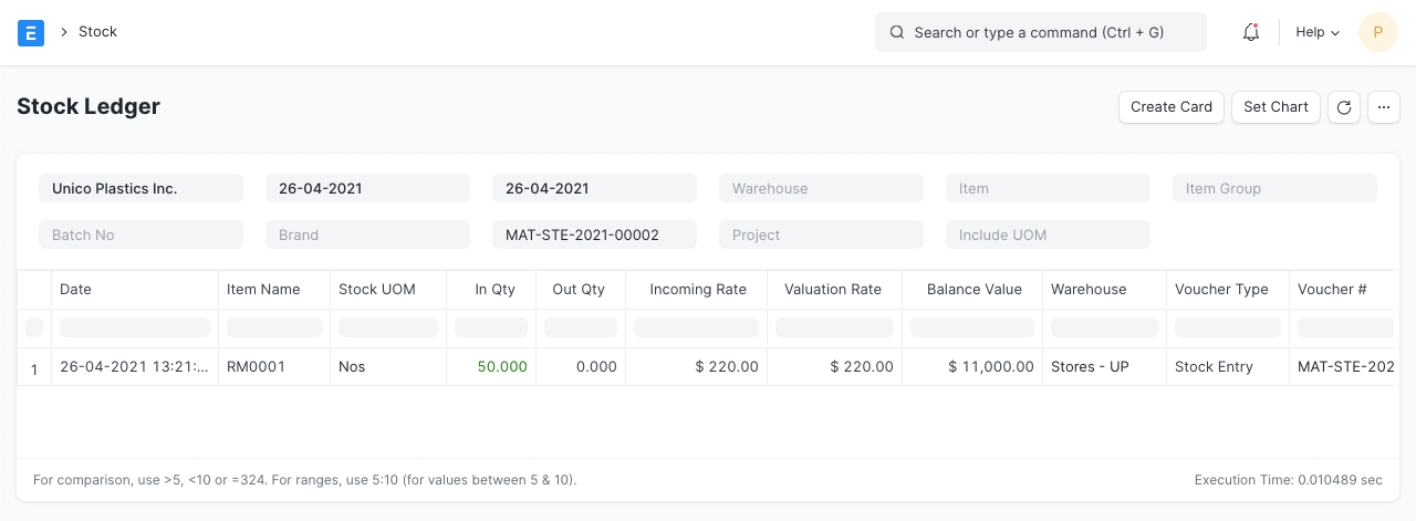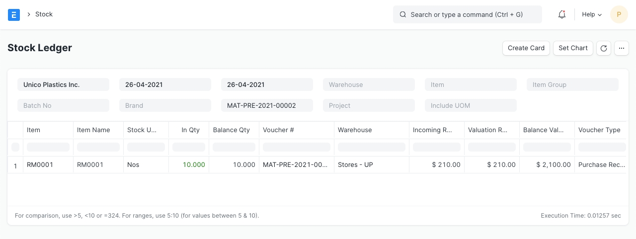 Suppose you have purchased 10 nos of item "RM0001" at $200 from supplier "Arcu Vel Quam Fabricators". Following are the details of Purchase Receipt: